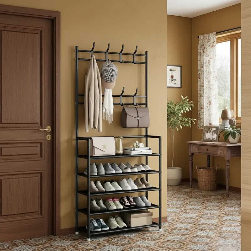 Hasta 20 pares aprox. distribuidos en 5 repisas. También puedes usar la barra superior y los ganchos para chaquetas, bolsos y gorras.