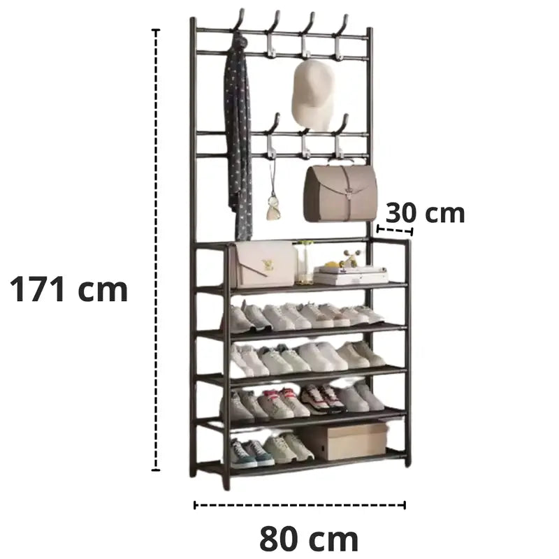 Hasta 20 pares aprox. distribuidos en 5 repisas. También puedes usar la barra superior y los ganchos para chaquetas, bolsos y gorras.